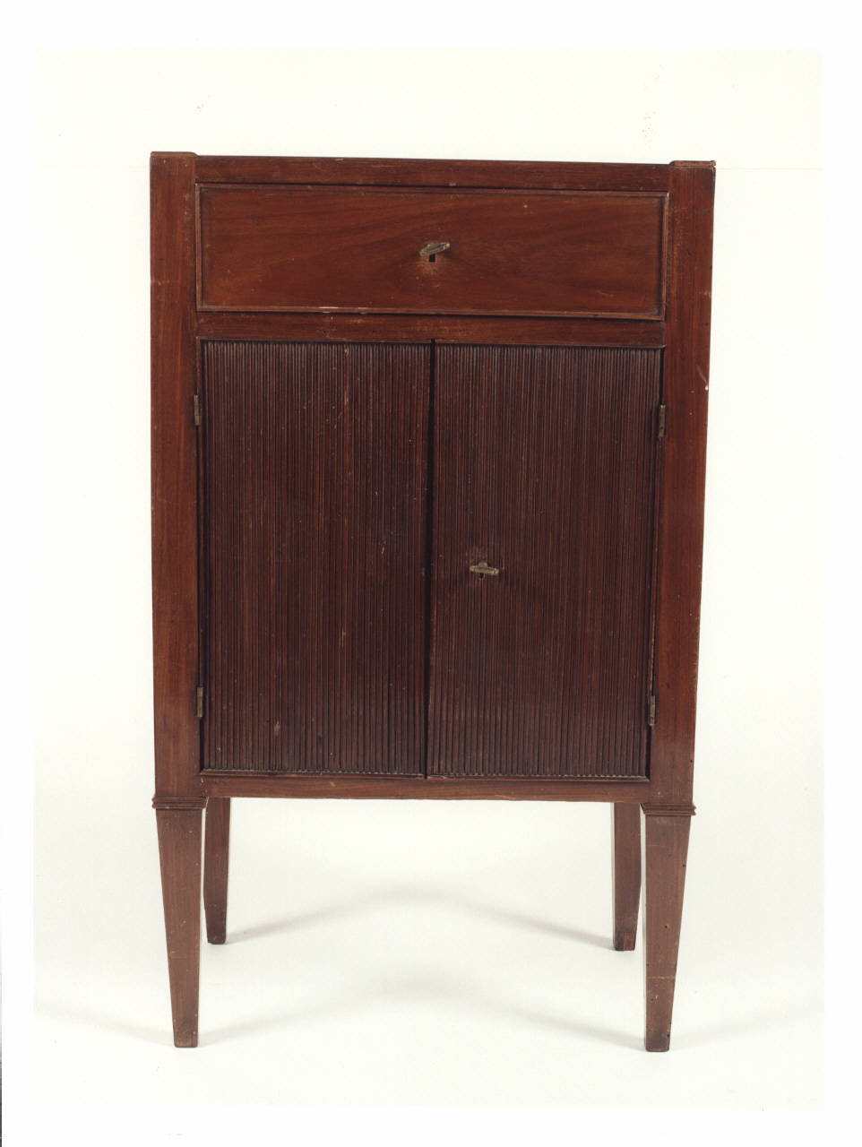 Due comodini in legno di mogano, cassetto superiore e due antine.\nLe antine hanno decoro a piccole scanalature. I sostegni sono molto semplici, diritti e rastremati verso il basso.