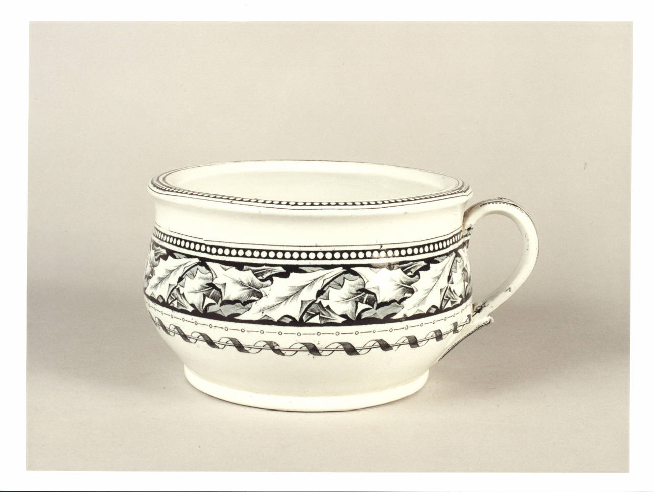Il vaso da notte presenta un decoro a fondo nero con tondi in colore bianco. La fascia centrale, sempre su fondo nero, presenta delle foglie di agrifoglio caratterizzate da un chiaroscuro a tratteggio sempre in colore nero. Conclude il tutto una sottile decorazione punto linea e nastriforme.