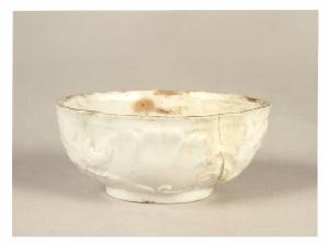 Ciotola in porcellana bianca con decori a rilievo ad anse e volute.
