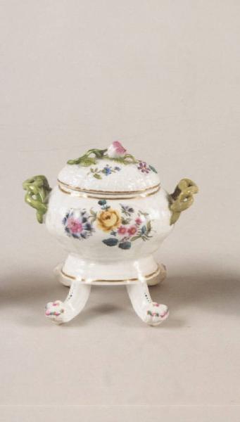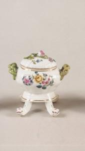 La piccola saliera in porcellana bianca poggia su quattro ricurvi sostegni. Decorata con motivi floreali in cui spicca la rosa circondata da piccole margherite o garofani. Il coperchio ha la stessa decorazione e pomolo formato da un piccolo bocciolo mentre i manici ricordano due rami verdi tra loro intrecciati. I bordi sono profilati in oro.
