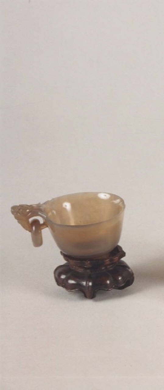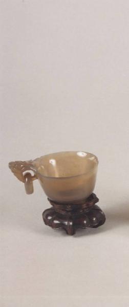 Ciotola cinese in giada con manico ad una sola ansa in cui vi è incastonato un anello dello stesso materiale.