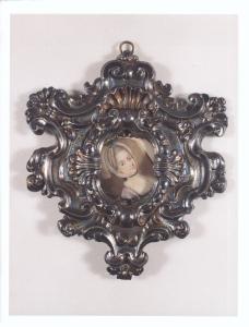 La miniatura ritagliata raffigura una giovane fanciulla vista di tre quarti, il volto inconiciato dalla cuffietta con sottogola che sottolinea, un po' impietosamente, il doppio mento. Delicati i trapassi chiaroscurali tipici dell'uso del pastello.\nCornice rococò in argento piuttosto elaborata costituita da motivi a conchiglia nella parte interna divisi da una bacellatura ovale, anse più accentuate in quella esterna con una delicata punzonatura tonda. Tocchi di azzurro e tracce di doratura.