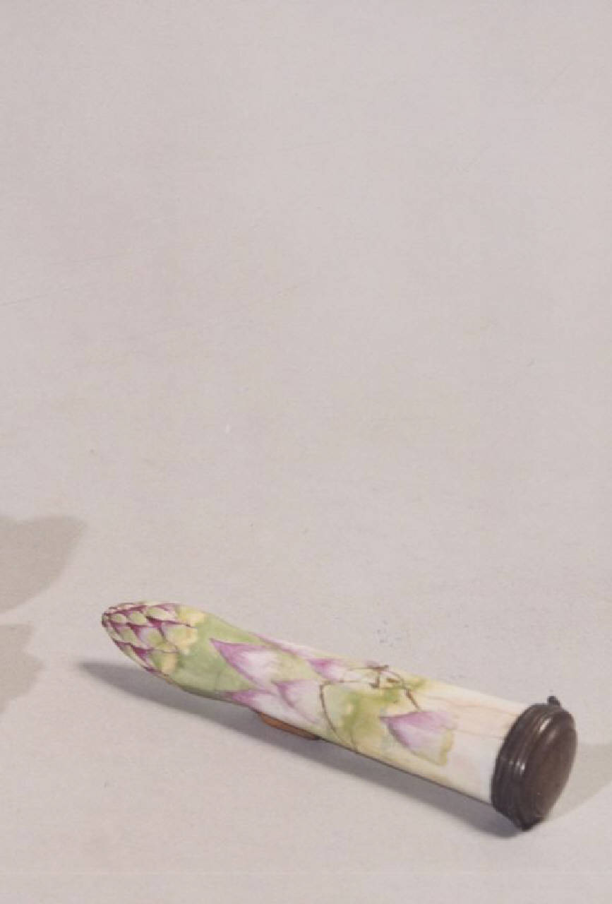 Portapillole a forma di aspargo, dipinto in viola e verde similmente alla realtà, con coperchio ovale in ottone.