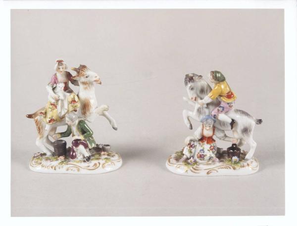 - NOTIZIE STORICO CRITICHE I due gruppi raffigurano una fanciulla con un cagnolino a cavallo di una capra che viene munta da un giovane e la scena contraria nell'altra scultura. Dipinta a tinte vivaci, con un'accentuazione bucolica nelle vesti floreali dell'amazzone e del cavaliere. La marca presente potrebbe identificare una manifattura inglese, quella di Bow, vicino a Londra, attiva tra il 1747 e il 1776.