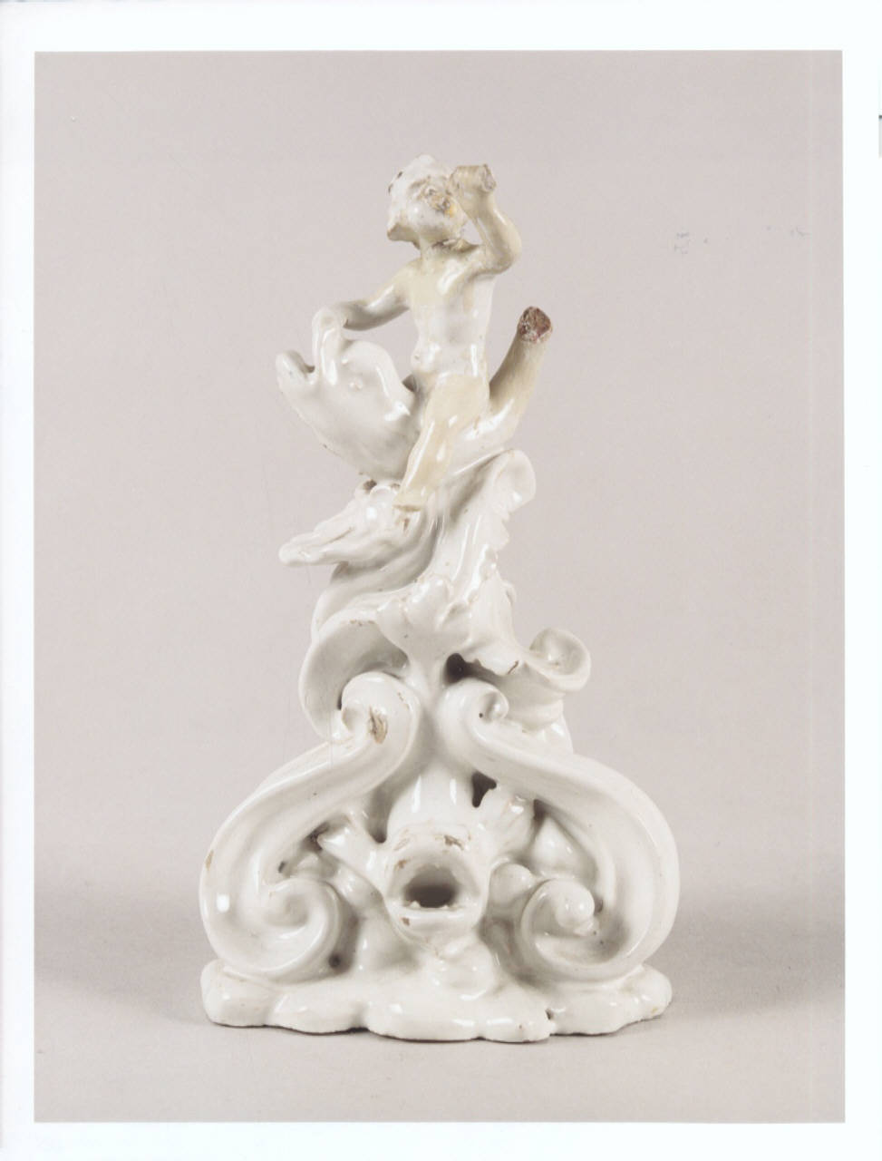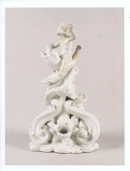 Putto che soffia nella buccina, a cavallo di un delfino; base formata da volute e delfino centrale.