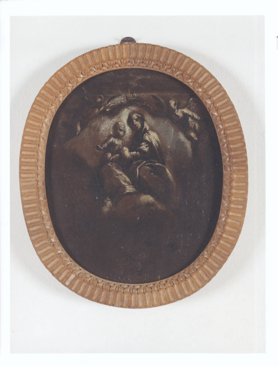 Olio su tela con incoronazione della Vergine con Bambino; cornice ovale in legno.