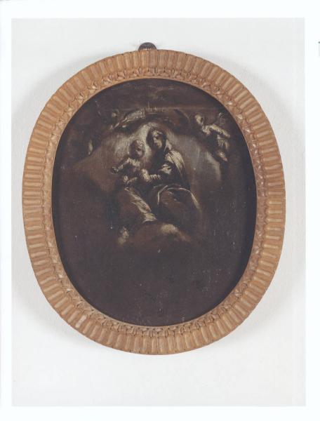 • NOTIZIE STORICO CRITICHE Il piccolo dipinto raffigura la Madonna col Bambino incoronata dagli angeli. L'esecuzione veloce, l'uso del monocromo con tocchi di luce in corrispondenza delle figure e le piccole dimensioni della tela portano a considerare il dipinto un bozzetto preparatorio per una composizione di dimensioni maggiori. Il dipinto venne donato al FAI nel 2003 da Antonino Mazzoni, ingegnere varesino che l'aveva a sua volta ricevuto come dono personale dall'antiquario A. Orsi, responsabile della cornice moderna. La piccola tela entrò nella collezione come opera di pittore anonimo tra Seicento/Settecento, superando l'attribuzione a Morazzone (1573-1626) di Lamberto Vitali e Franco Russoli scritta sul retro della tela. Nel 2003 Francesco Frangi lo attribuisce ad Antonio Maria Crespi, detto il Bustino, per forti analogie con l'opera raffigurante "Madonna col Bambino e i Santi Abbondio ed Eufemia", conservata nella chiesa dei Santi Nazaro e Celso di Brienno (Como). Antonio Maria Crespi, membro della famiglia dei Crespi Castoldi, operanti in Lombardia nel XVII secolo, fu un pittore fortemente legato ai linguaggi controriformistici come rivelano i suoi numerosi dipinti a soggetto sacro; risentì dell'influsso del Morazzone col quale forse collaborò al Sacro Monte di Orta (da: Pittura a Como e nel Canton Ticino dal Mille al Settecento, a cura di Mina Gregori, Milano [Cariplo] 1994, pp. 176 (ill. 96), 309). Prima dell'apertura della Villa al pubblico l'opera si trovava nella stanza di Nedda Necchi, a fianco del suo letto, sopra il comodino.