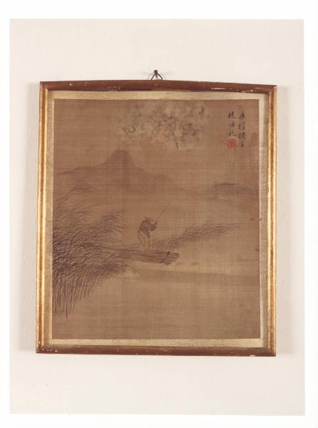 Pannello di seta dipinta con figura di pescatore; racchiuso in moderna cornice dorata.
