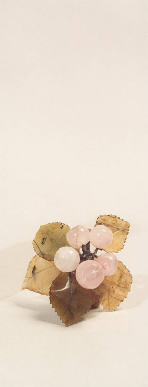 Grappolo di uva in quarzo rosa con foglie in agata verde.