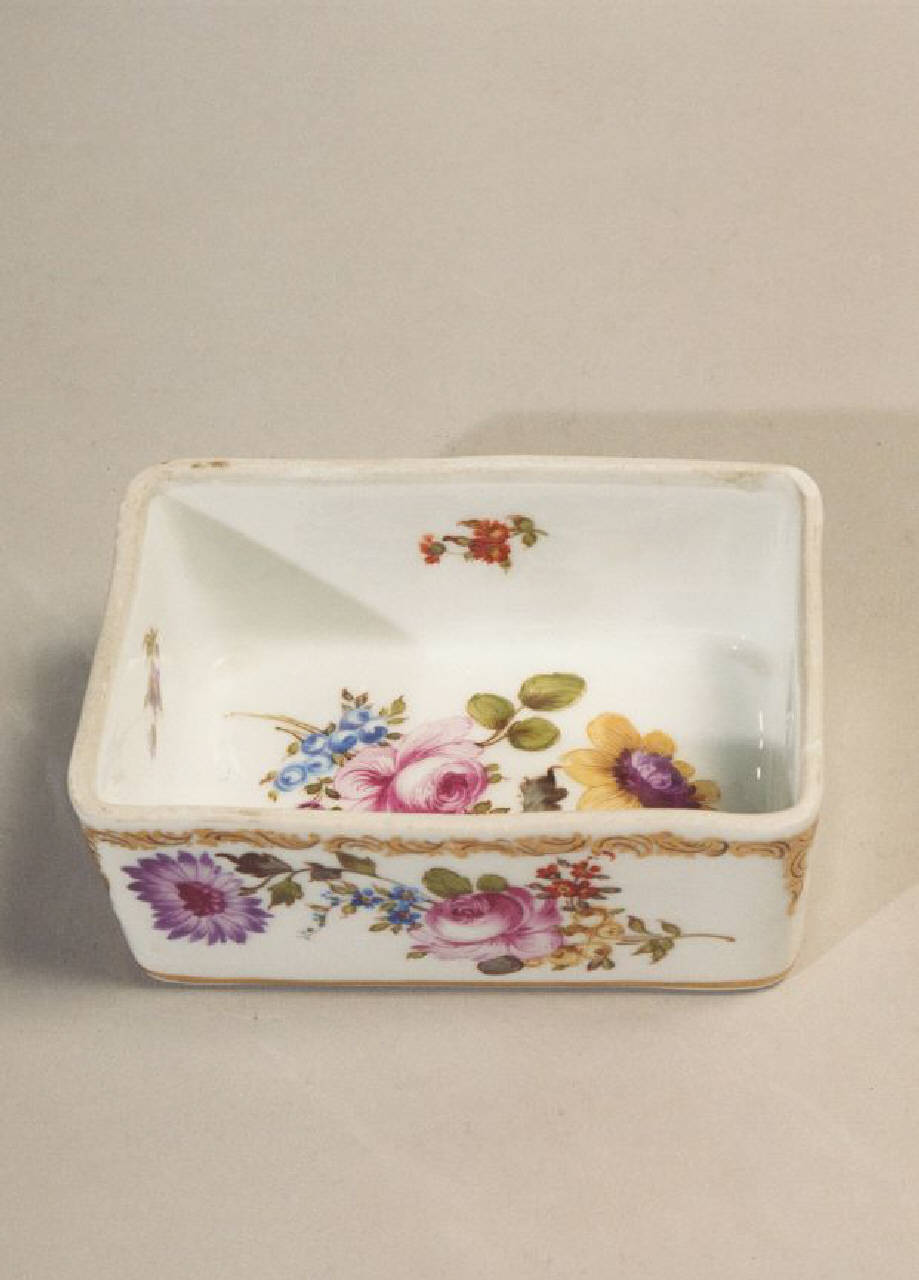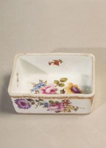 - NOTIZIE STORICO CRITICHE Questa piccola burriera, anche se inconsueta nella forma poichè di solito si presenta formata da un vassoio sormontato dal coperchio con piccolo manico, è di manifattura tedesca, come le notizie reperite negli inventari della casa indicano, anche se non è stato possibile identificare il marchio di produzione. Risulta gradevole nella sua delicata composizione floreale e nella semplice bordura superiore in oro.