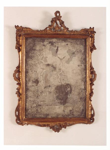 Importante cornice lignea dorata settecentesca, con piccoli trattini orizzontali, volute a ricciolo, conchiglia centrale sia nel lato inferiore che superiore, tipiche del periodo Rococò.\nLo specchio raffigura entro rettangolo il Battesimo di Cristo, con la presenza della Colomba dello Spirito Santo nella zona superiore.