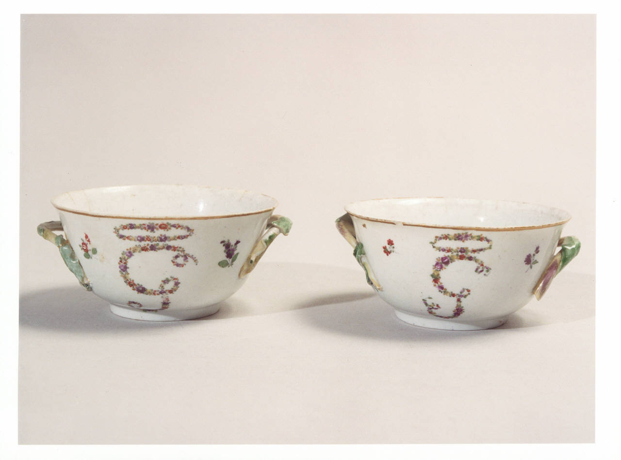 Tazze con manici laterali, bordo dorato, decoro floreale e monogramma centrale.
