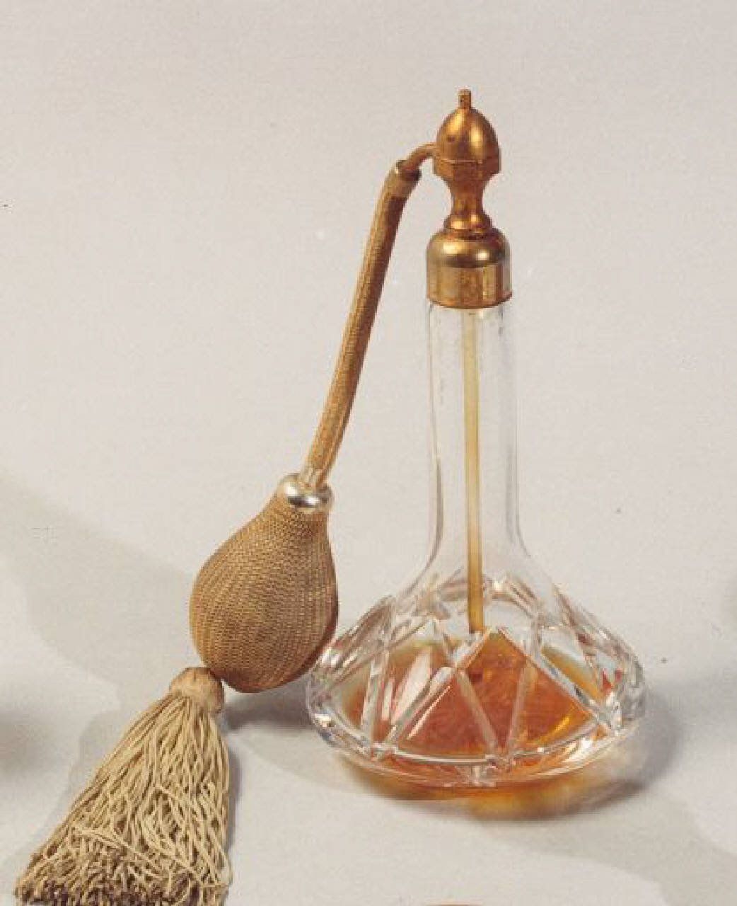 Grazioso nebulizzatore per profumo, peraltro ancora presente all'interno, in vetro sfaccettato.