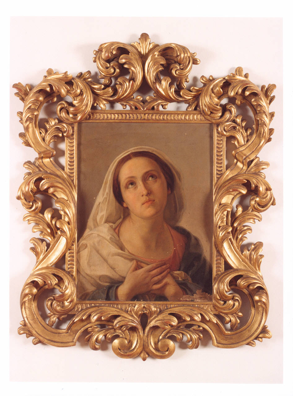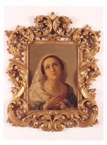 Dipinto su tela con figura femminile; pregevole cornice lignea dorata ed intagliata con motivo a volute a foglia d'acanto.