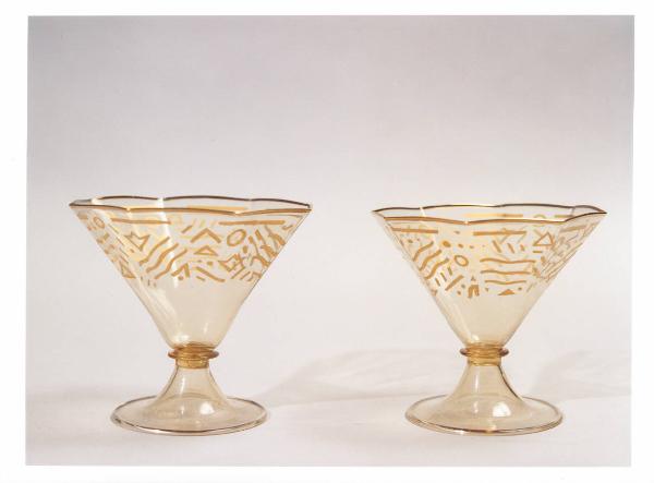 Servizio di bicchieri in vetro soffiato di Murano giallo, privi di stelo, con piede saldato al calice dai bordi sagomati e dorati. I bicchieri sono caratterizzati da decori a motivi geometrici, dipinti a mano nelle tonalità dorate.