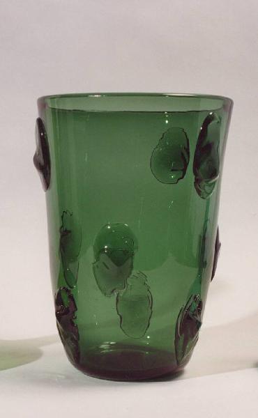 Vaso in vetro verde con decori a rilievo nello stesso colore e materiale.
