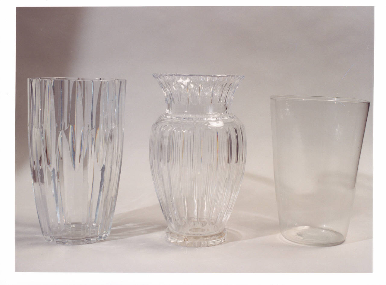 Tre vasi di cristallo e vetro: a sinistra intagliato, centralmente lavorato con motivo a bacellatura, a destra semplice.