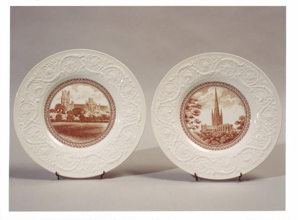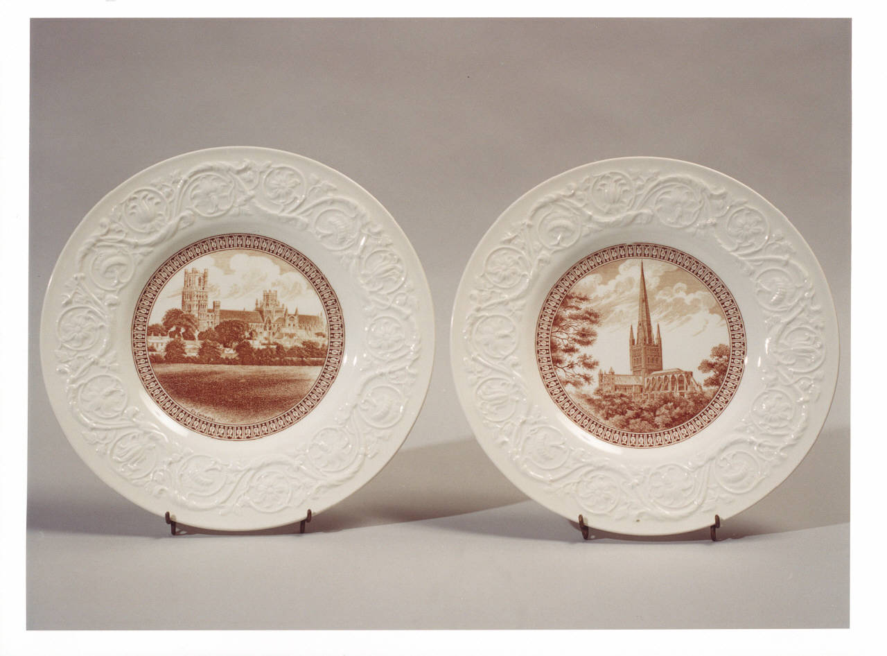 Dodici piatti con bordo a rilievo con decoro floreale; all'interno immagini di cattedrali inglesi.