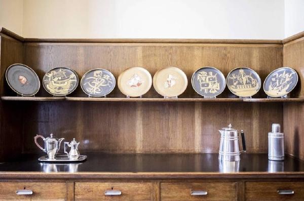 • NOTIZIE STORICO CRITICHE Giovanni Gariboldi, autore del disegno dei piatti, ricorre in maniera raffinata alla bicromia, impreziosendo le superfici con decori che stilizzano figure fantasiose. Sulle superfici dei piatti a fondo scuro si stagliano sirene, teste di cavalli, imbarcazioni, pesci, serpenti, figure oniriche e animali fantastici, dipinte con tratti stilizzati in color oro. Si attinge allo stesso repertorio anche per i decori realizzati al centro dei piatti a fondo dorato, con figure di dimensioni più ridotte tratteggiate usando\n il rosso e il bianco.