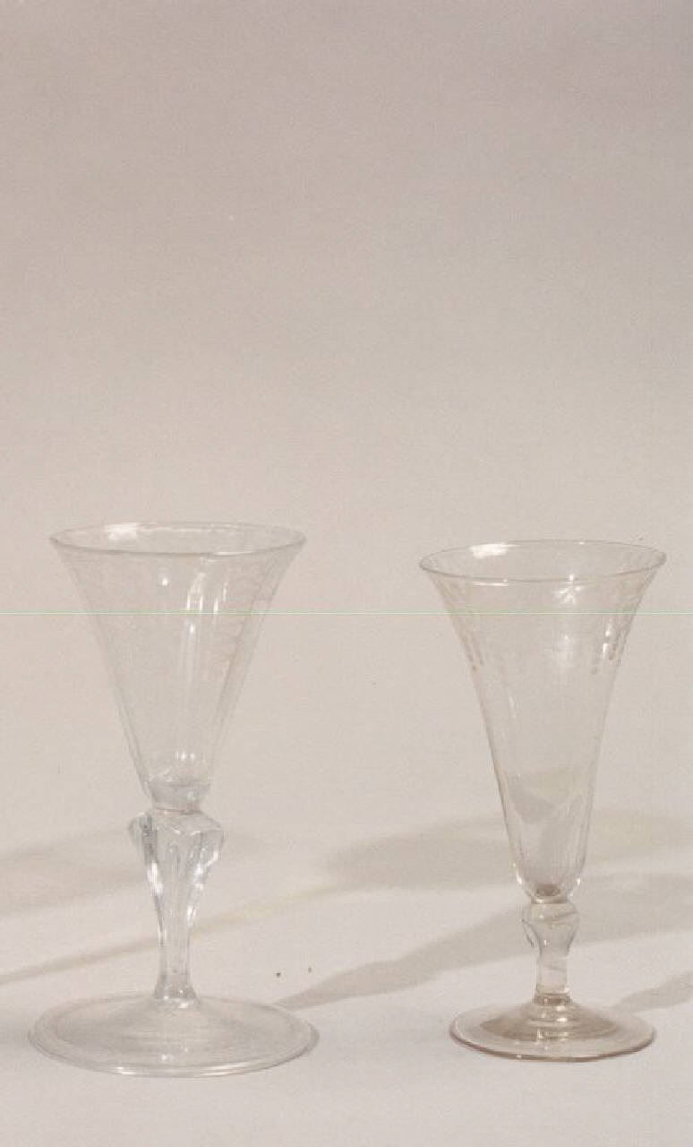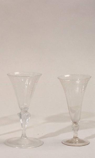 Due preziosi calici in vetro soffiato, come le piccole bolle d'aria presenti evidenziano; riferibili alla prima metà del XVIII secolo, di straordinaria leggerezza.