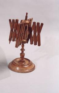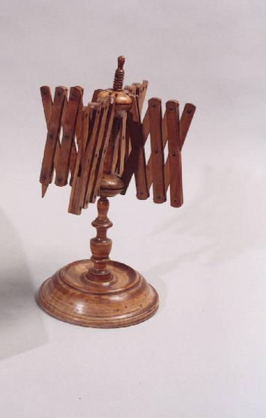 Filatoio in legno costituito da un'asta centrale con piede di appoggio rotondo; tendilana estensibili a maglie romboidali.