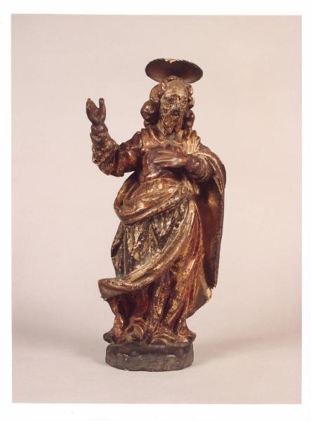 - NOTIZIE STORICO CRITICHE Piccola statuetta raffigurante un Santo non ben identificato in quanto privo di qualsiasi attributo. Probabilmente San Pietro, per la vicinanza, se non è casuale, a San Paolo, e per la stessa fattura. Nonostante il precario stato di conservazione, la caduta della doratura e i restauri approssimativi di cui è stata oggetto l'opera, si ipotizza una datazione alla prima metà del sec. XVI, per l'andamento mosso del panneggio e della figura.