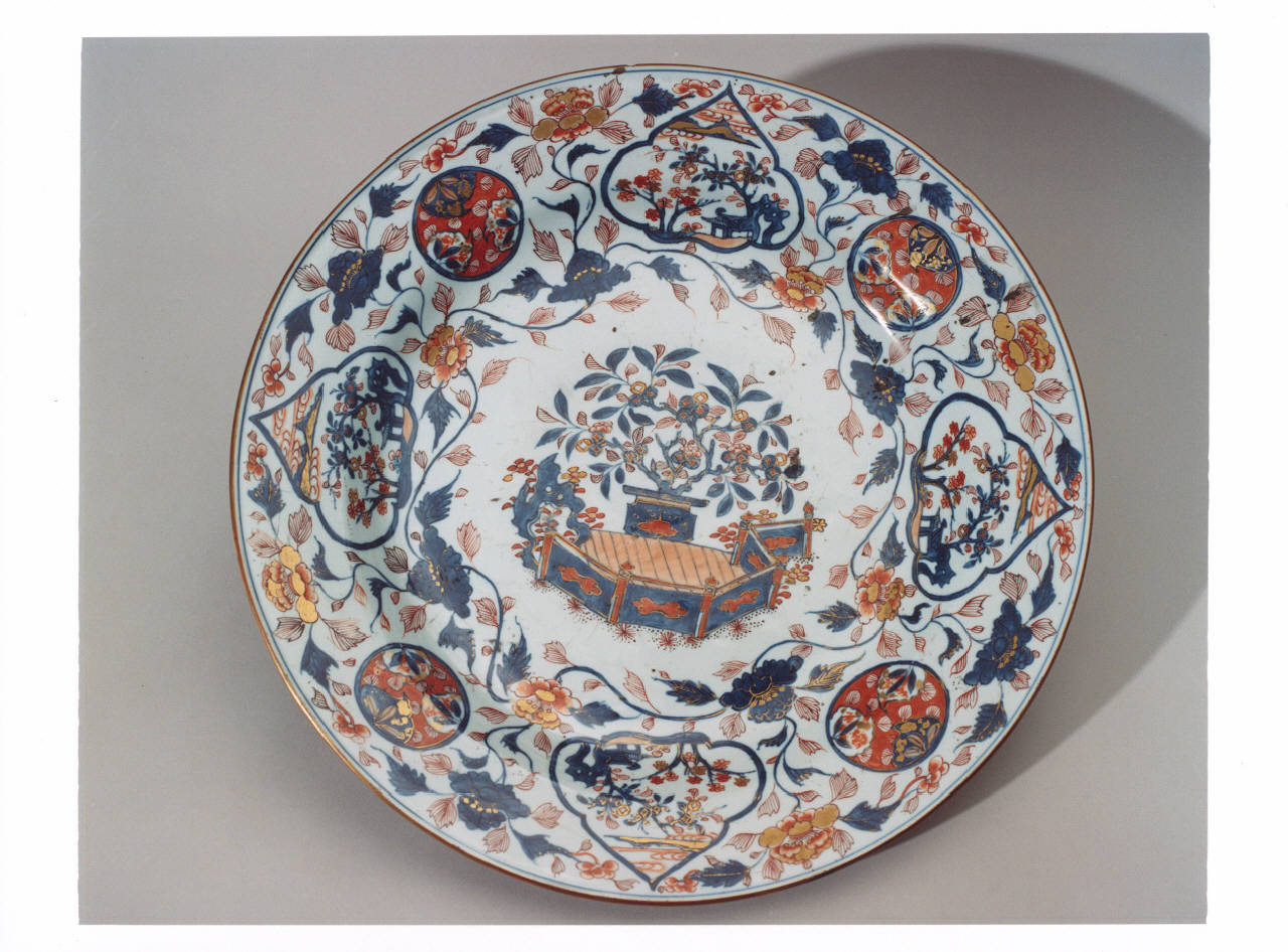 - NOTIZIE STORICO CRITICHE La porcellana Imari prende il nome dal porto di Imari da cui venivano esportate nel resto dell'arcipelago giapponese; venivano prodotte nella provincia di Hizen nella regione di Arita (Giappone). Dopo il 1650, in seguito all'espansione del mercato, la porcellana Hizen subì l'influenza dei metodi, a livello tecnologico, cinesi. Si introdusse, cioè, lo smalto policromo sopra l'invetriatura, ottenendo magnifiche porcellane decorate. A partire dalla metà del XVII secolo la produzione Nabeshima, dal nome della famiglia, divenne la più importante. Prodotta tra il 1690 e il 1720 e creata per il gusto Shogun, rappresenta il culmine della raffinatezza nella produzione di porcellana giapponese. Prima dell'apertura della Villa al pubblico il piatto era collocato sul tavolo della Camera della Signora Gigina Necchi.