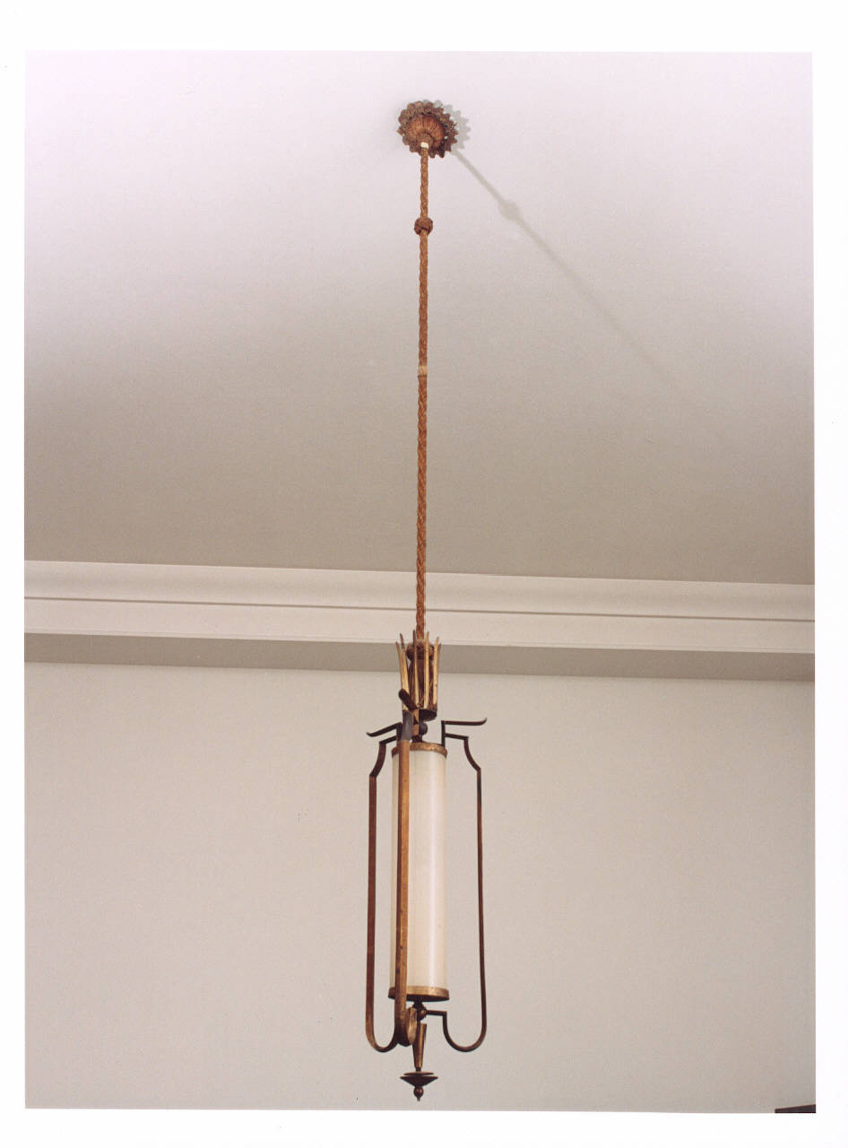 Lampadario a lanterna di modeste dimensioni con cilindro in vetro sostenuto da un telaio composto da tre elementi in metallo sagomati, raccordati alle estremità a dei piccoli supporti, anch¿essi metallici, dalle forme g\neometriche.