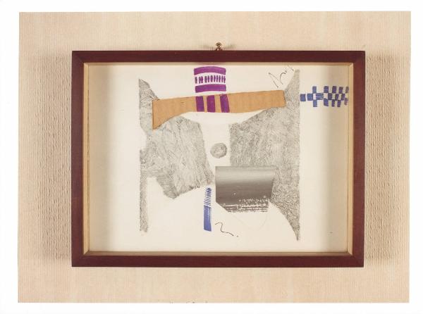 Collage con materiali diversi e acquarello su incisione su carta velina, composizione astratta; cornice di legno.