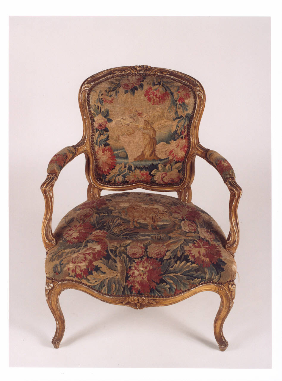 Poltrona cabriolet Luigi XV.\nLa poltrona si connota per una linea curva e leggera, come i sostegni evidenziano, e un piccolo motivo floreale rococò. E' rivestita con un tessuto ad arazzo con l'uso di lane policrome che compongono un delicato disegno con scena pastorale.