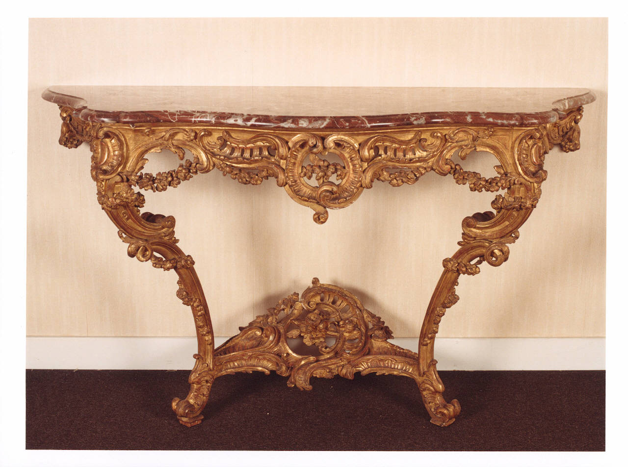 Elegante console con piano in marmo broccatello di Spagna; motivo decorativo a ricciolo, conchiglia centrale sotto il piano e raccordo a tema vegetale. Si segnala nella parte interna dei sostegni un gradevole motivo a petalo, in origine dorato, come si nota in diversi punti.