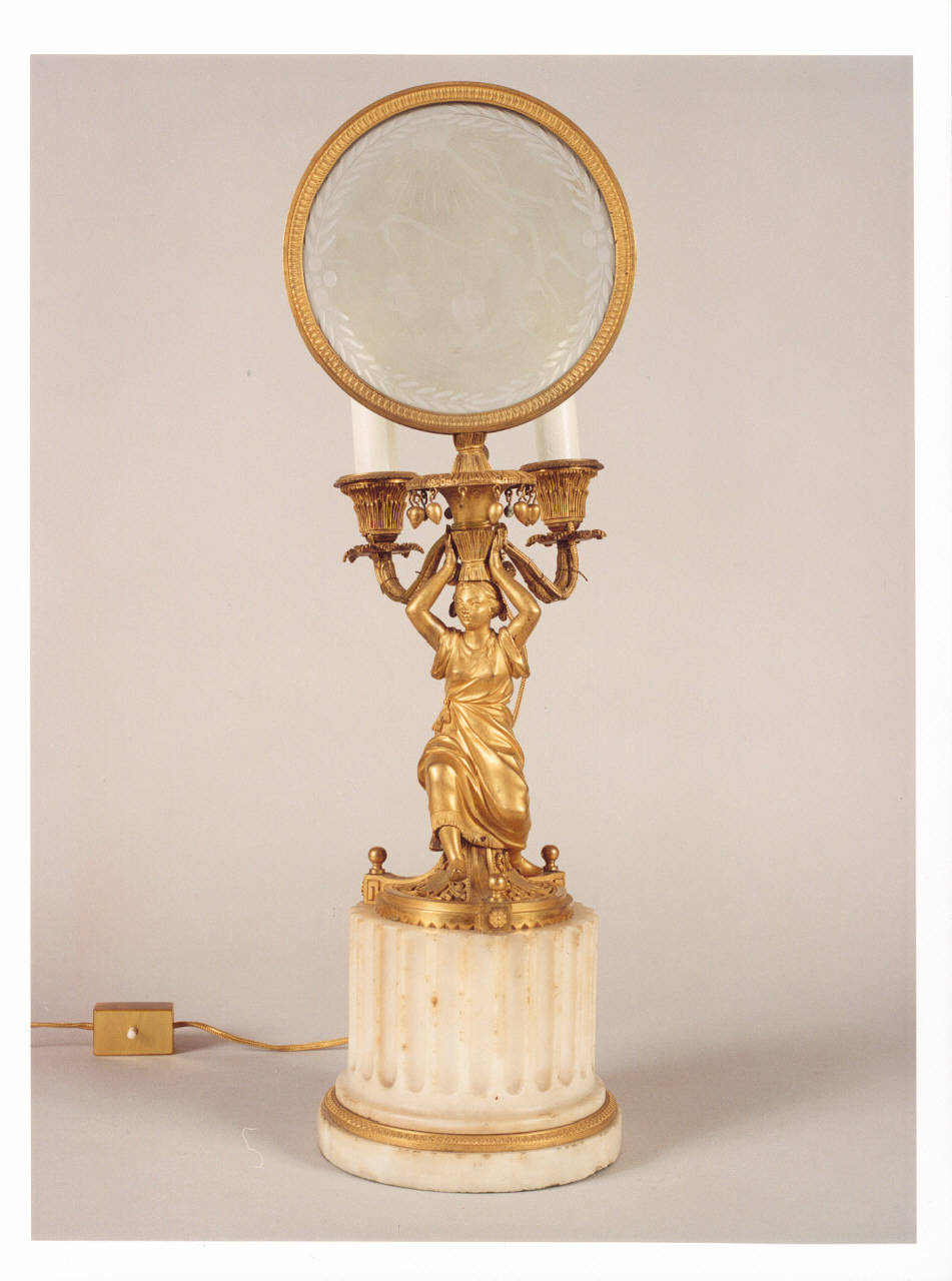 - NOTIZIE STORICO CRITICHE Del tutto particolare tanto la tipologia del candelabro con paralume, di cui il vetro probabilmente non pertinente, quanto quella del corpo costituito da una figura femminile chiaramente di ispirazione sinizzante, reggente i due bracci e il paralume. Il bel modellato della veste, del volto e della anatomia sottende il lavoro di un raffinato modellatore. Iconograficamente è del tutto eccentrico, e l'unico parallelo possibile è quello con il candelabro d'argento genovese datato al 1789. La particolarità del basamento, che caratterizza questo candelabro, trova il proprio modello di ispirazione in una incisione di Jean Bérain del 1690 anche se totalmente reinterpretata.\nIl manufatto in precedenza si trovava nel piano seminterrato di Villa Necchi.