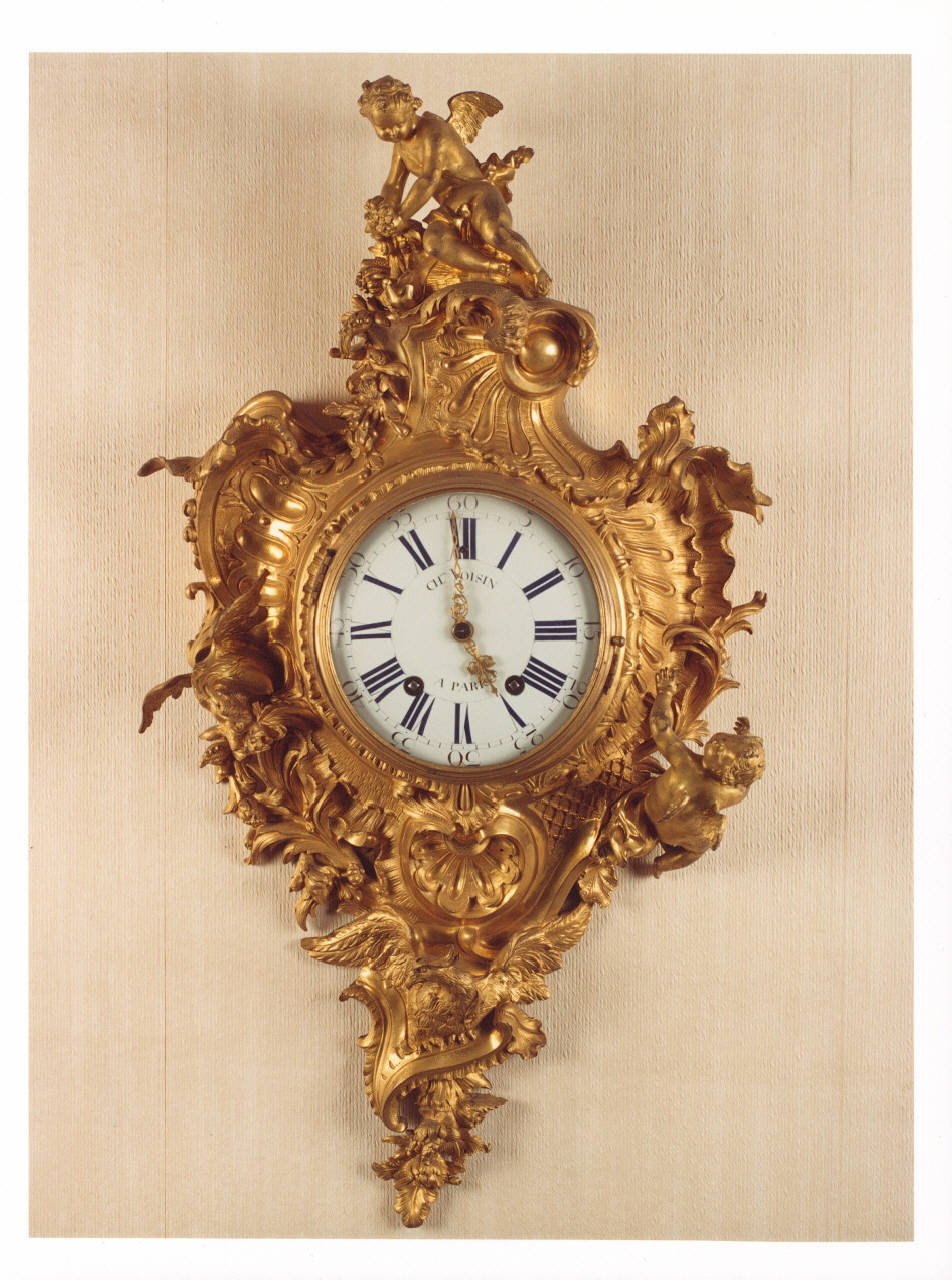 Orologio cartel in bronzo dorato e cesellato con putti e draghi.