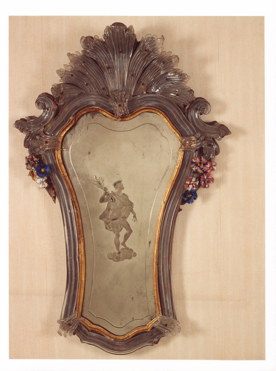 Specchiera in vetro di Murano con fiori in pasta di vetro; al centro Zeus.