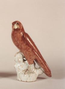 Scultura a tutto tondo in porcellana dipinta raffigurante un falco.\nIl falco è raffigurato appollaiato su rocce con atteggiamento molto naturalistico. Il piumaggio è realizzato con grande abilità a tratteggio accurato di linee con colori marrone e rosso bruno di ferro. Il falco rientra nel repertorio tradizionale cinese.