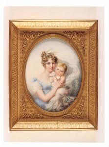 Acquerello su carta tesa su un supporto smaltato, raffigurante una giovane donna con un bambino. La miniatura è inserita in una cornice in bronzo d\norato decorata con motivi a palmette e racemi. Miniatura di Jean-Baptiste Isabey (1767-1855), 1810; opera firmata e datata.