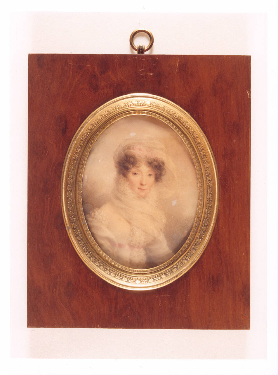 - NOTIZIE STORICO CRITICHE La miniatura è opera del pittore francese Jean-Baptiste Isabey (1767-1855\n). L'artista francese, sfruttando la moda del tempo di Luigi XVI, diventa noto per le sue miniature, realizzate per scatole, tabacchiere e bottoni per l'abbigliamento. La moda della corte si diffonde presto tra la borghesia, facendo aumentare la domanda di miniature e portando così Isabey a ela\nborare una modalità pittorica tanto veloce quanto personale: una tecnica \nrapida, meno attenta e precisa, ma che gli permette di trattare con naturalezza tanto l'incarnato quanto i tessuti degli abiti e i decori nei capelli. Dal 1810 utilizza una sorta di carta velina simile alla pergamena, ma più facile da tendere, che fissa su una lastra di metallo smaltata sul dav\nanti. Gli accordi cromatici resi possibili da questa tecnica sono in questo genere di opere la misura della loro bellezza. La miniatura raffigura una giovane donna avvolta in un vaporoso velo bianco che, partendo dai capelli, le incornicia il collo e il volto, dagli occhi scuri e dalla piccola bocca con labbra sottili. L'abito che indossa è bianco, con maniche lunghe\n a rouches. La vita alta è sottolineata da un nastro rosa, dello stesso c\nolore dei fiori dell'acconciatura. L'opera faceva parte della collezione dell'imprenditore milanese Alighiero de' Micheli (1904-1995), composta da più di 140 oggetti e donata al FAI dopo la sua morte con legato testamenta\nrio. L'intera raccolta è stata collocata nella camera della Principessa d\ni Villa Necchi Campiglio a Milano, con un allestimento di Filippo Perego che ha l'obiettivo di ricostruire il salotto del collezionista, dove originariamente erano custodite le opere. Facevano parte della collezione dipinti veneti (Rosalba Carriera e Canaletto), miniature di Jean-Baptiste Isabey, mobili e orologi francesi, specchiere veneziane, ceramiche milanesi, porcellane francesi e cinesi, tabacchiere francesi, inglesi e tedesche.