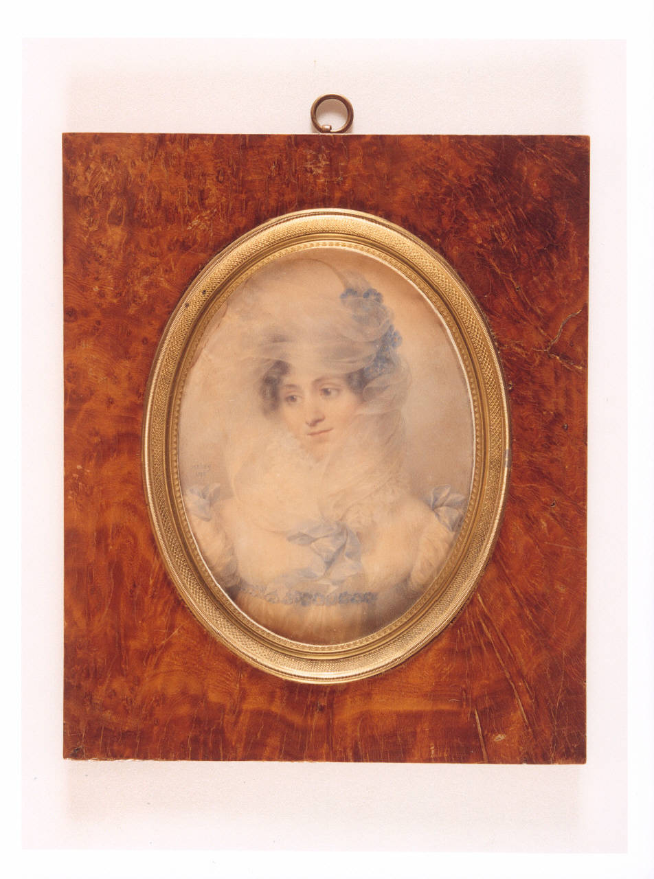 Acquerello su carta raffigurante una giovane donna in abiti bianchi e azzurri, inserito in un ovale in bronzo dorato; cornice rettangolare esterna in radica. Miniatura di Jean-Baptiste Isabey (1767-1855), 1816; opera firmata e datata.