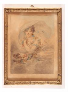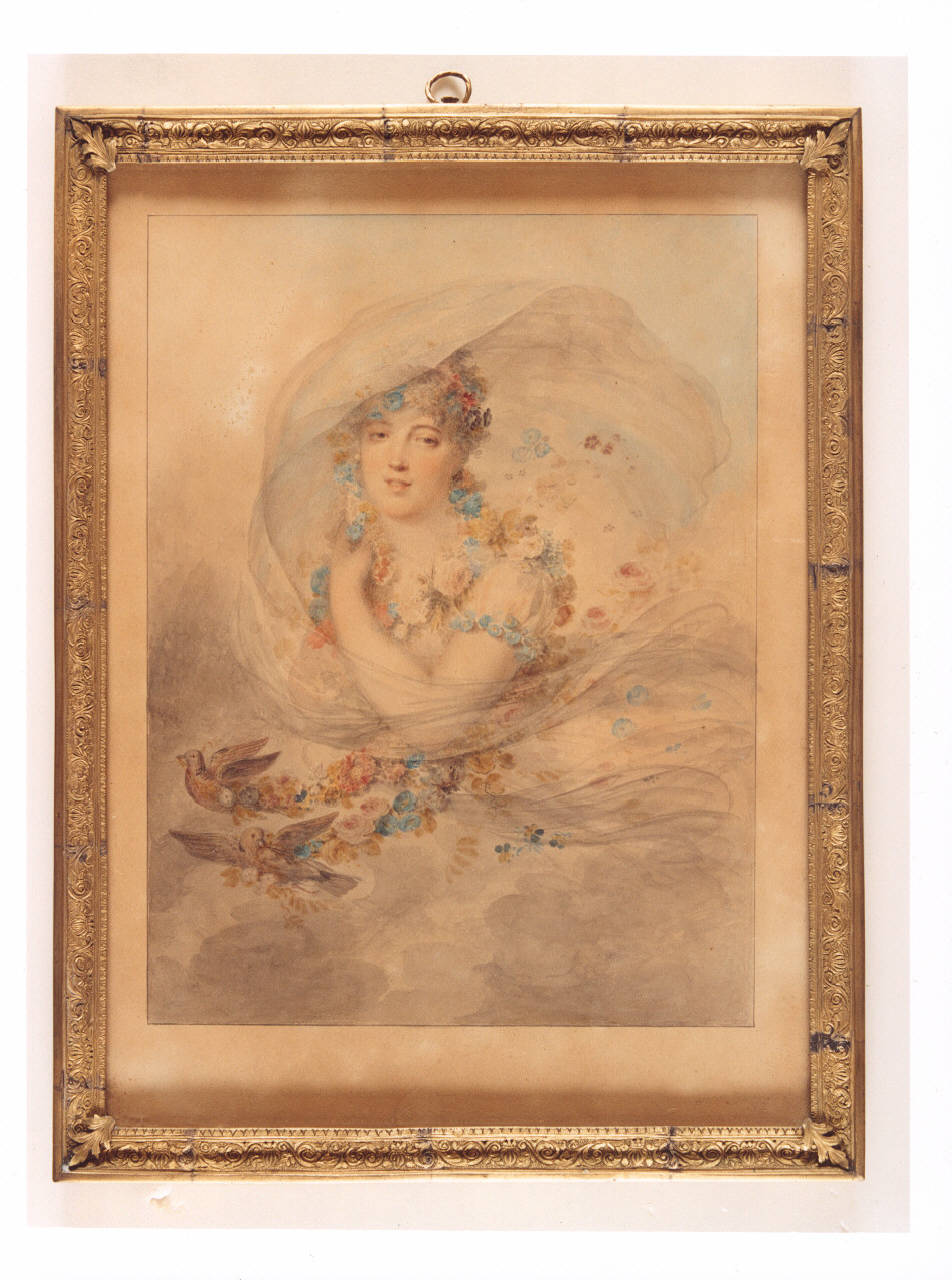 - NOTIZIE STORICO CRITICHE L'opera è parte dell'ampio nucleo donato al FAI nel 1995 da Alighiero de' Micheli. ll dipinto raffigura una giovane donna in abito velato con capelli biondi intrecciati con un serto di fiori pendente a sinistra, tenuto da due uccellini alle estremità. L'ampia scollatura rotonda è adornata da fiori di varie specie, misure e colori, che scendendo dalla spalla destra le cingono la vita. Il volto è animato dagli occhi scuri e dalla labbra dischiuse in un lieve sorriso. La figura femminile è stata identificata con Laure Regnaud de Saint-Jean-d'Angély (1776-1857) grazie all'etichetta sul retro, scritta da Isabey per Michel Regnaud de Saint-Jean d'Angély, uomo politico francese marito di Laure Regnaud. L'identificazione è stata inoltre confermata da Cyril Lécosse nel recente volume "Jean-Baptiste Isabey: petits portraits et grands desseins", dove pubblica il dipinto e lo confronta col ritratto di François Gérard della medesima nobildonna nel 1799.