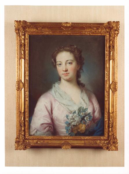 - NOTIZIE STORICO CRITICHE L'opera è parte dell'ampio nucleo donato al FAI nel 1995 da Alighiero de' Micheli. La gentildonna viene ritratta a mezzo busto, coi capelli semiraccolti e acconciati con piccole perle; indossa un elegante abito rosa con una composizione floreale al centro e una mantella blu. Il dipinto, realizzato su carta con la tecnica a pastello, è stato riferito a Rosalba Carriera, pittrice veneziana che diede grande impulso alla diffusione in Italia della tecnica dei ritratti a pastello. Questa tecnica che trova la sua massima diffusione nel corso del Settecento permetteva di sfruttare la consistenza morbida e sfumata del pastello traducendo i valori materici e in particolare l'epidermide umana. Nei delicati ritratti di Rosalba Carriera, la materia pittorica appare quasi come polvere o cipria che trasforma i tratti del volto con una lucente grazia rococò.