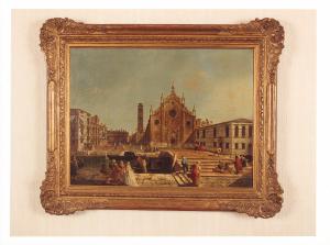 - NOTIZIE STORICO CRITICHE L'opera è parte dell'ampio nucleo donato al FAI nel 1995 da Alighiero de' Micheli. La veduta rappresenta il Campo dei Frari con la trecentesca facciata della chiesa ripresa frontalmente e, a destra, l'edificio del convento, ora sede dell'Archivio di Stato di Venezia. Sull'altro lato del campo, davanti alla Scuola della Passione, è raffigurata, cosa alquanto rara, un'elegante carrozza dorata, proprio laddove si trova il cosidetto "sotopòrtego" delle Carrozze. Sul ponte in primo piano, inoltre, è individuabile un animato episodio di vita quotidiana: un gruppo di persone soccorre un malcapitato che ha appena subito un borseggio, mentre il responsabile scappa in direzione opposta. Il dipinto venne eseguito da Michele Marieschi, pittore e incisore veneziano, famoso come autore di "capricci" e vedute, per le quali si distinse - rispetto ai modelli del contemporaneo Canaletto - per l'esecuzione a pennellate più dense e corpose, per un'interpretazione più scenografica e per la precisione volumetrica dello spazio architettonico. La medesima scena ambientata sul campo dei Frari è stata più volte ripresa da Marieschi, come ci testimoniano alcune sue incisioni. Questa veduta, insieme alla "Veduta del Ponte di Rialto con il Palazzo dei Camerlenghi", fece parte nell'Ottocento della collezione Lepke di Berlino; dopo varie vicende collezionistiche, le opere rientrarono in Italia nel 1949 e furono esposte nel 1967 alla mostra dedicata ai Vedutisti veneziani del Settecento.