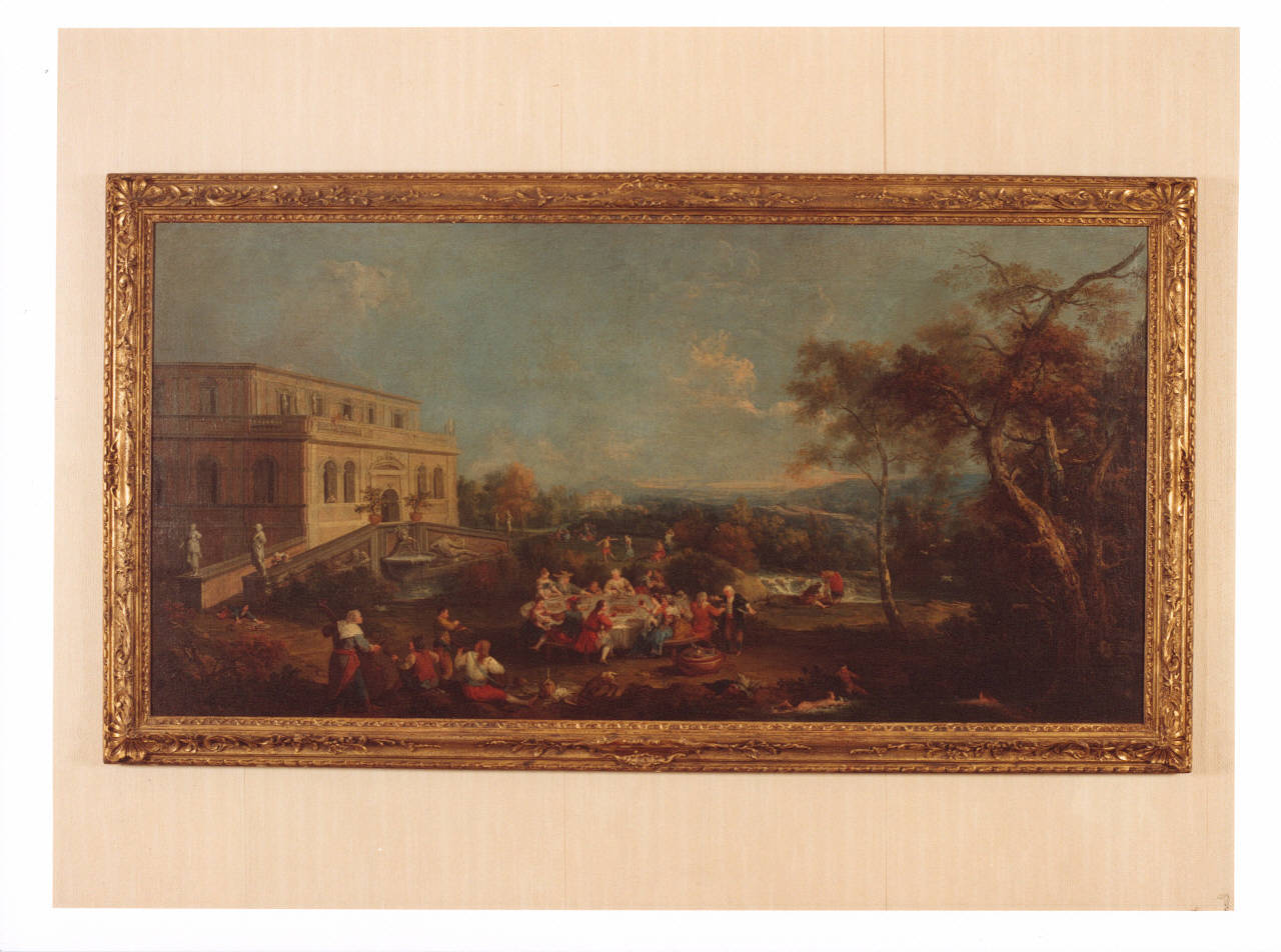 - NOTIZIE STORICO CRITICHE L'opera è parte dell'ampio nucleo donato al FAI nel 1995 da Alighiero de' Micheli. Il dipinto rappresenta una bucolica scena conviviale ambientata in un paesaggio veneto dai toni intimistici. In primo piano si svolge un allegro banchetto nel quale eleganti personaggi si alternano a umili popolani raffigurati in pose di carattere grottesco. La composizione è arricchita da scene minori: all'estrema sinistra un garzone viene ritratto mentre scivola per terra con un piatto da servizio; un gruppo di suonatori sulla sinistra intrattengono gli invitati al banchetto; sulla destra tre bambini fanno il bagno in un fiume; due fanciulle sono ritratte presso il fiume con canna e lenza; figure più piccole sono rappresentate in secondo piano in momenti di svago e convivialità. Il paesaggio avvolge la scena in un'atmosfera gaia e festosa, sfumando delicatamente sulla linea dell'orizzonte. La villa, raffigurata sulla sinistra, è descritta con precisione nei dettagli architettonici e ricorda il classico stile delle ricche residenze della campagna toscana. Il dipinto venne eseguito da Francesco Zuccarelli, pittore di origine toscana che iniziò la sua carriera artistica a Roma come ritrattista e autore di soggetti storici ispirati alla produzione di Claude Lorrain e Nicolas Poussin. Successivamente si dedicò alla pittura di paesaggio d'intonazione arcadica; trasferitosi a Venezia nel 1732, la sua produzione raggiunse una vasta notorietà e la sua fama si diffuse tra i principali collezionisti europei.