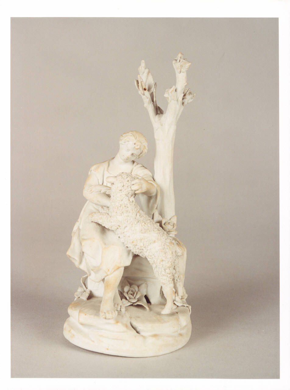 Gruppo con figura femminile e agnello sorretti da una base circolare decorata con un albero e alcuni fiori di rosa.