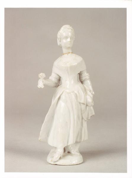 - NOTIZIE STORICO CRITICHE La manifattura Le Nove, vicino a Bassano, nacque nel 1752 per volontà di Pasquale Antonibon, già proprietario di una fiorente fabbrica di maioliche. Ebbe sorti altalenanti a causa della malattia del fondatore che delle diserzioni degli operai, riuscendo comunque a produrre eccellenti porcellane fino al 1800. La produzione di piccole figure si colloca intorno agli anni della fine del settecento, con modelli molto simili fra loro per il riutilizzo di stessi identici stampi, per cui le variazioni erano affidate soprattutto ai panneggi.\nLa statuetta in precedenza si trovava nel piano seminterrato.