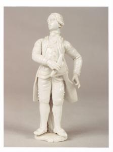 Piccola scultura a tutto tondo con raffigurazione di giovane uomo dall'elegante abito e cappello a tricorno.