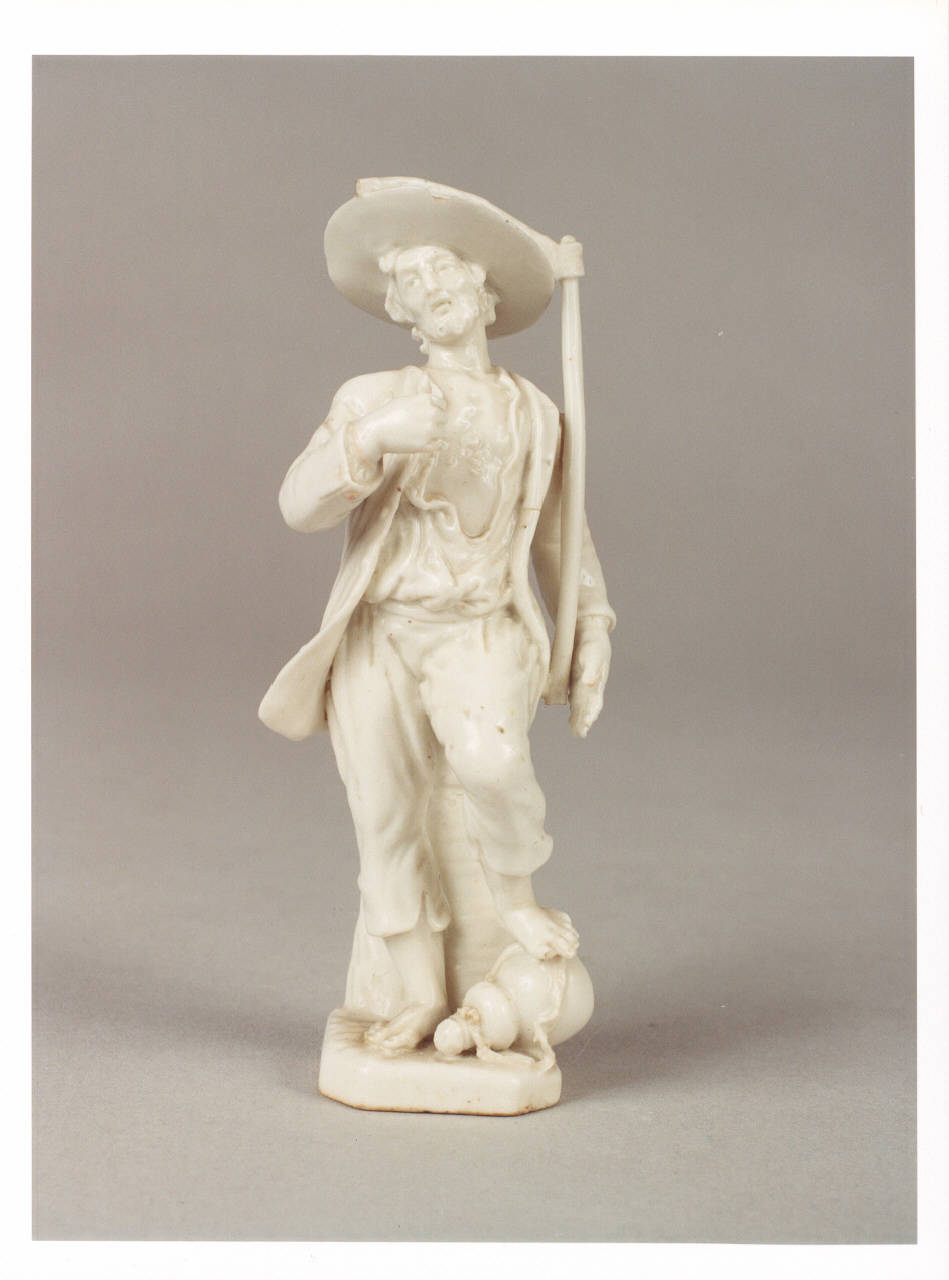 Figura maschile di contadino, con abiti dimessi, cappello a tesa larga. Regge nella mano sinistra una falce, la cui lama poggia sul capo.