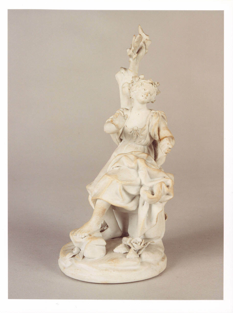- NOTIZIE STORICO CRITICHE La manifattura Le Nove, vicino a Bassano, nacque nel 1752 per volontà di Pasquale Antonibon, già proprietario di una fiorente fabbrica di maioliche. Ebbe sorti altalenanti a causa della malattia del fondatore che delle diserzioni degli operai, riuscendo comunque a produrre eccellenti porcellane fino al 1800. La produzione di piccole figure si colloca intorno agli anni della fine del settecento, con modelli molto simili fra loro per il riutilizzo di stessi identici stampi, per cui le variazioni erano affidate soprattutto ai panneggi.\nLa statuetta in precedenza si trovava nel piano seminterrato.