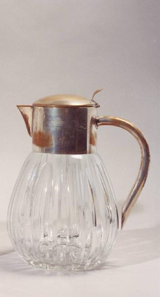 Caraffa in cristallo con decoro a bacellatura in verticale, chiusura e manico in argento.