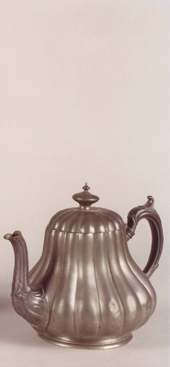 Teiera in peltro con struttura a bacellatura come il coperchio.
