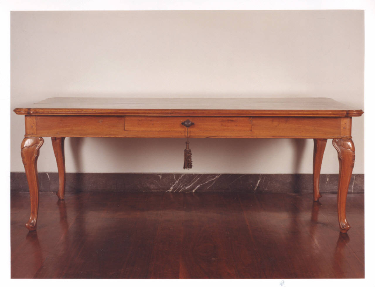 Tavolo in legno di noce chiaro ad un cassetto, piano sagomato e gambe cabriolet.